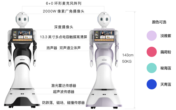 人型设计+灵活双臂+全向运动拟人化形象给顾客带来更有亲和力的情感体验,而灵活的运动模式则为顾客呈现更为丰富的肢体语言