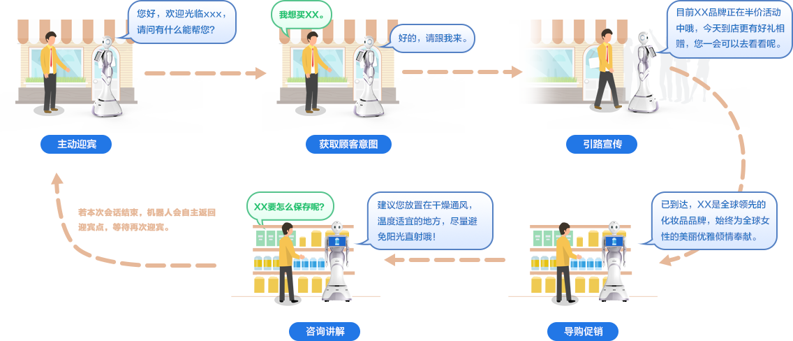 主动迎宾主动迎宾当顾客经过机器人时,机器人通过摄像头人脸检测,对顾客及时响应,主动发起迎宾问候并进行广告营销。对有人脸记录的顾客,通过精准人脸识别后可对客人进行个性化打招呼。